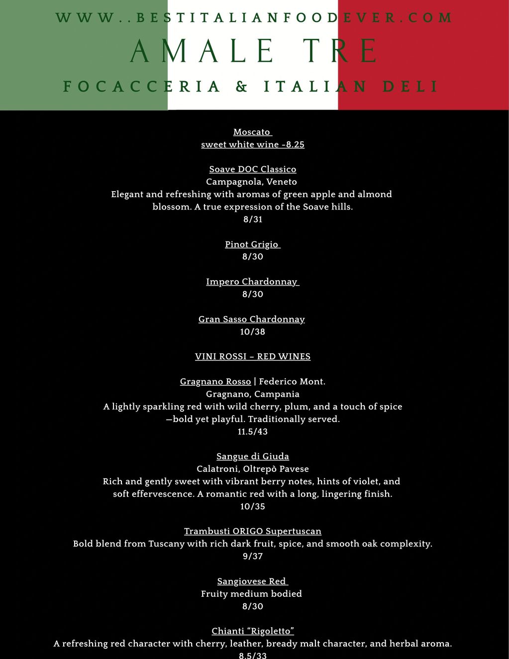 Welcome to Virginia's 1st Focacceria. Amale Tre Focacceria is a family owned casual Italian eatery specializing in authentic Italian casual authentic focaccia, deli sandwiches, & artisanal baked goods. Inspired by the love for tradition and family, The name "Amale Tre" means "Love them 3", representing the owners 3 daughters, Shai , Sophia & Milania.